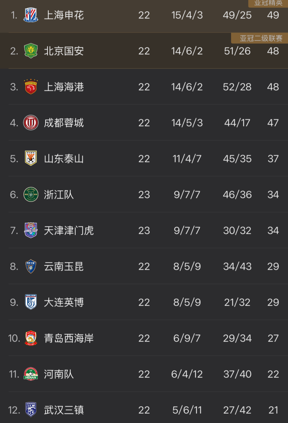 此外,成都蓉城本轮5-1大胜云南玉昆,距离榜首只有2分差距。这4队已经形成争冠集团,与其他球队拉开了至少10分的分差。