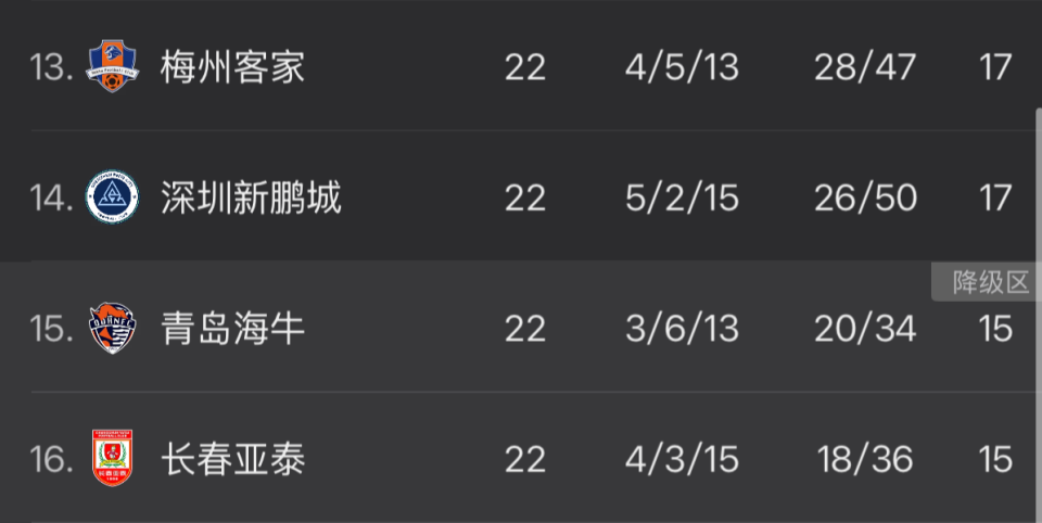 中超保级形势在本轮过后更加混乱。亚泰1-0击败新鹏城,取得保级大战两连胜的同时送对手5连败,虽然仍排名垫底,但亚泰距离安全区只有2分差距。梅州客家2-2战平浙江队,也拿到了宝贵的一分,中超后四名只差2分。