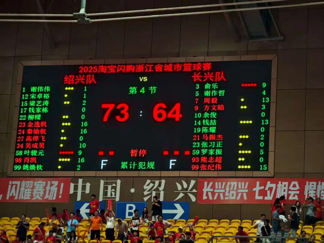 比赛进入第四节,长兴队连进两个三分球,暂时领先绍兴队4分,绍兴队加强了防守压迫,并通过连续进球将比分反超,落后4分到反超4分!长兴调整战术,增加内线传球配合,然而没能抵挡绍兴的猛烈攻势。比赛最后一分钟,比分来到64比68,双方进入全力冲刺阶段,最终绍兴以73:64胜长兴。